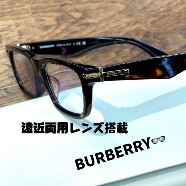 バーバリーの重厚感あるべっ甲模様のセルフレームに遠近両用レンズを組み合わせ。